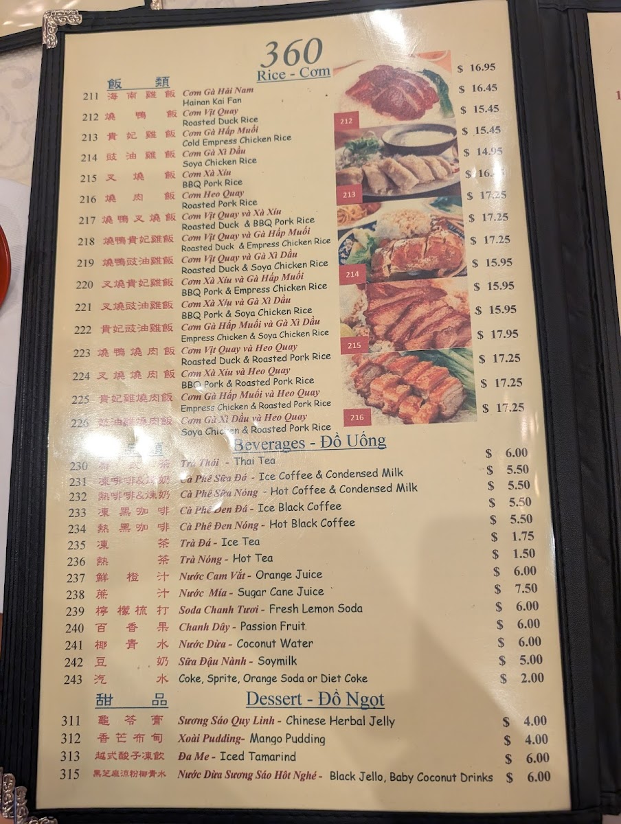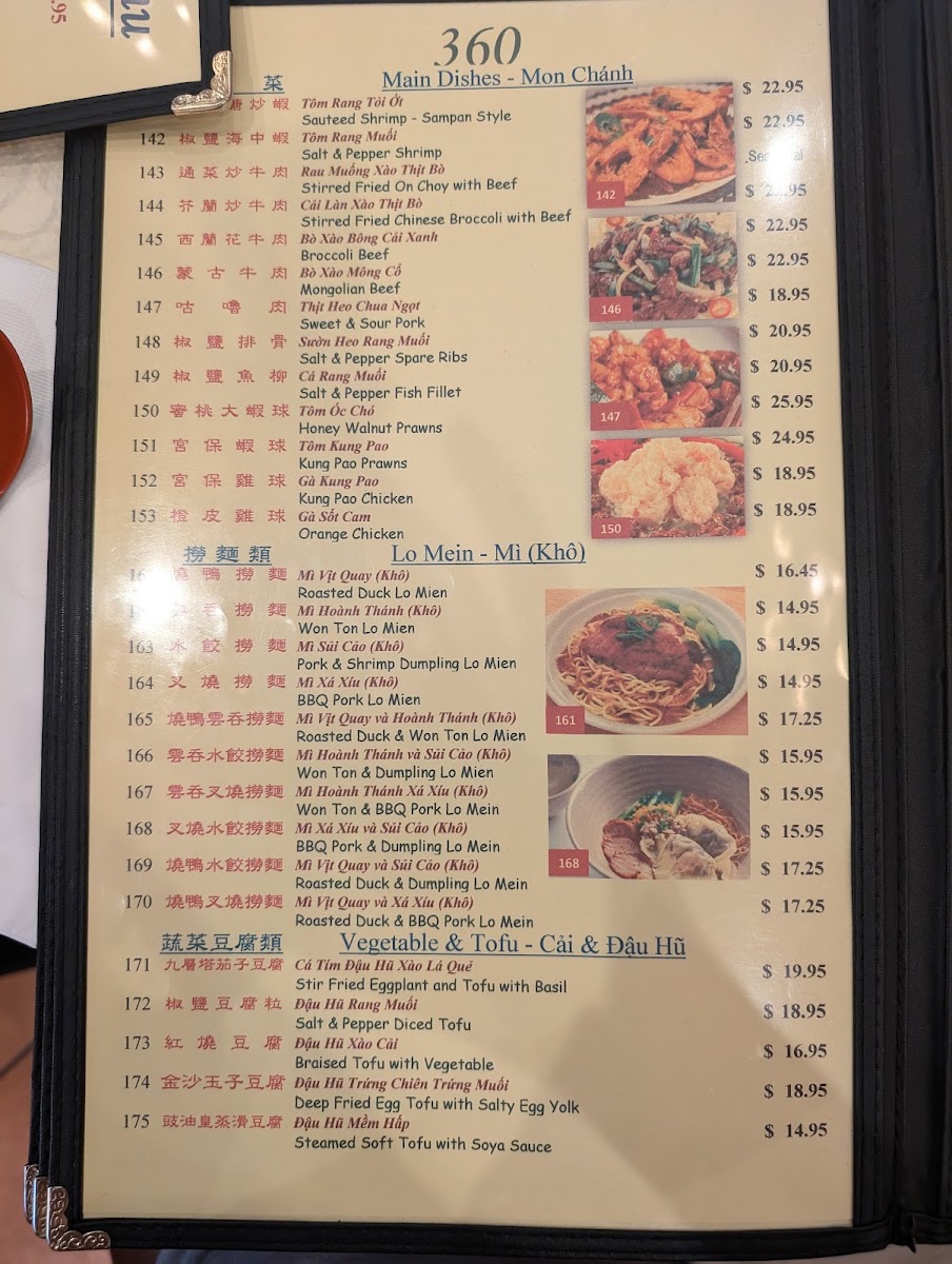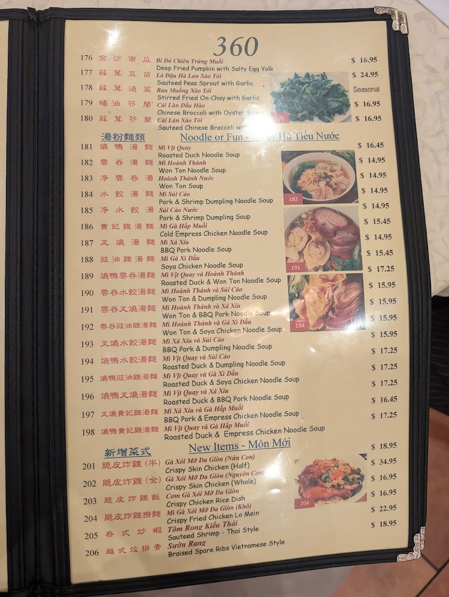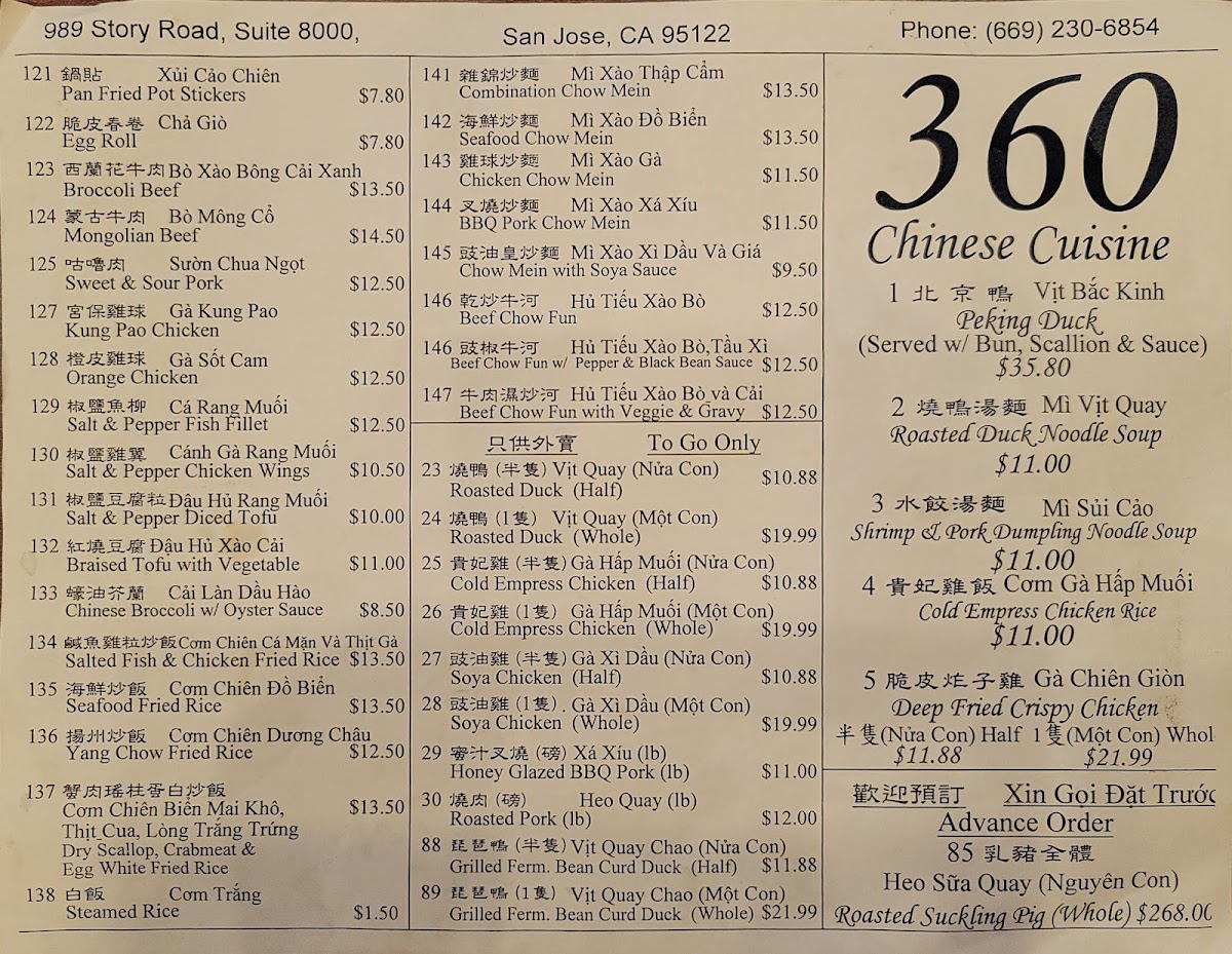 Welcome to the 360 Chinese & Vietnamese Cuisine Menu, where you can experience a delightful fusion of two rich culinary traditions. Located in the heart of San Jose, CA, this restaurant offers a diverse range of dishes that blend the bold flavors of Chinese and Vietnamese cuisine. From savory stir-fries to fragrant pho, each dish is crafted with fresh, quality ingredients, ensuring an authentic and satisfying dining experience. Whether you’re craving crispy spring rolls, tender dumplings, or a hearty bowl of noodle soup, the menu has something to satisfy every palate. The inviting atmosphere and flavorful dishes make this spot a go-to for anyone looking to enjoy delicious Asian fusion cuisine.